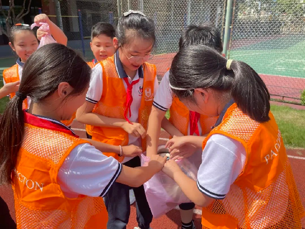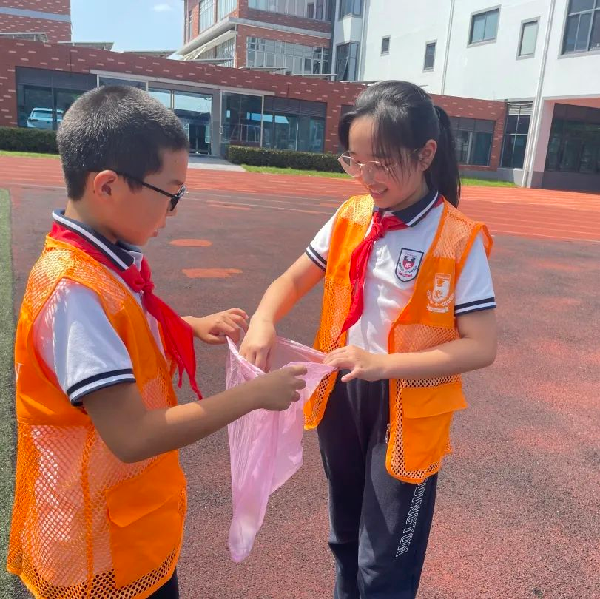 此外,大队辅导员金兰佳组织大队部的学生干部们以身作则,在学校的操场上进行义务劳动。孩子们身穿橙色马甲,在操场上形成了一道靓丽的风景线。他们的一低头、一弯腰,无不彰显着博华学子们的孺子牛精神。