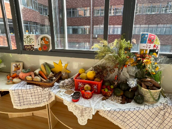 孩子们从家里带来了大小不一、种类多样,颜色各异的蔬果,一起布置出属于自己班级的“微景观”,老师们以多种形式让孩子们认识秋天的农作物、观察不同种类的蔬果,和伙伴交流自己的发现。金秋时节,瓜果飘香。丰收是自然的馈赠,也是幸福的传承。