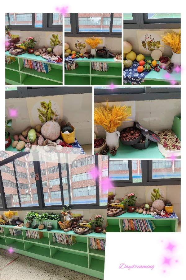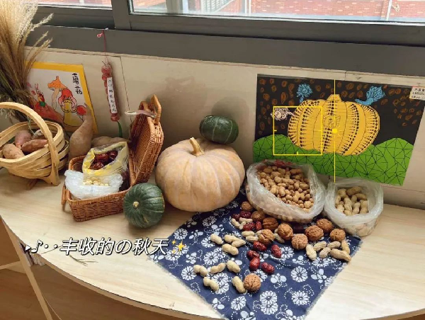 秋天不是金色的吗?的确!它给大自然带来了丰硕的果实,也赏赐了无数得以延续的食粮。秋天的自然角,也满是收获的味道。跟随着秋天的脚步,教师、家长与孩子们共同收集各种秋收农作物,辣椒、花生、玉米、柿子、红薯等鲜艳夺目的瓜果蔬菜,品种丰富的干果。一起分类布置了各班的“自然角”,让学生们感知秋天的变化和丰富,体会到丰收的喜悦。